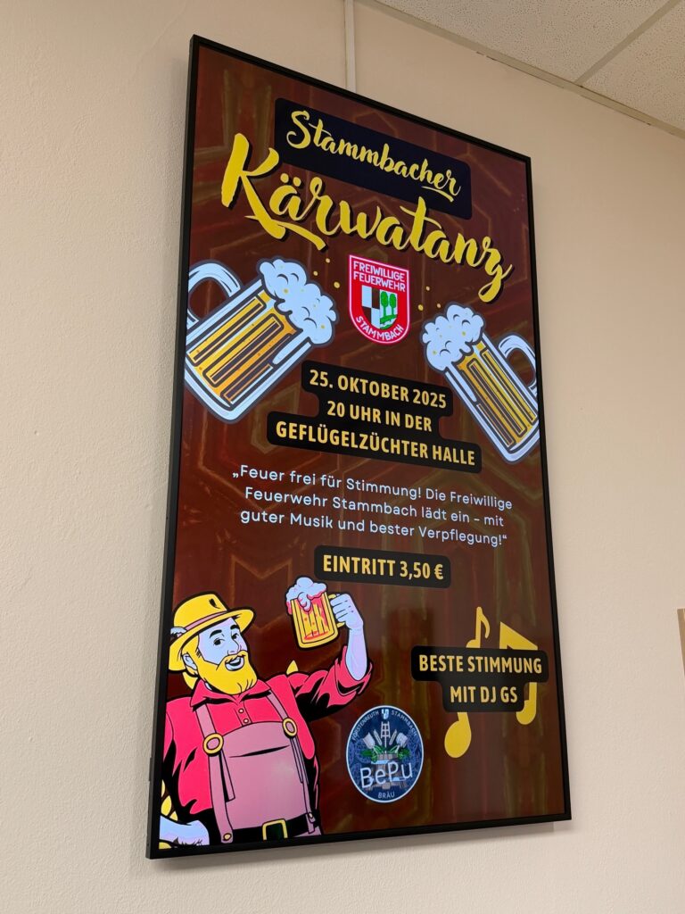 Stammbacher Vereine haben nun kostenlos die Möglichkeit für Ihre Angebote und Veranstaltungen zu werben. Zudem wird auch der Veranstaltungskalender der Marktgemeinde Stammbach synchronisiert. Auch das Wetter und Nachrichten werden im Wechsel mit angezeigt.